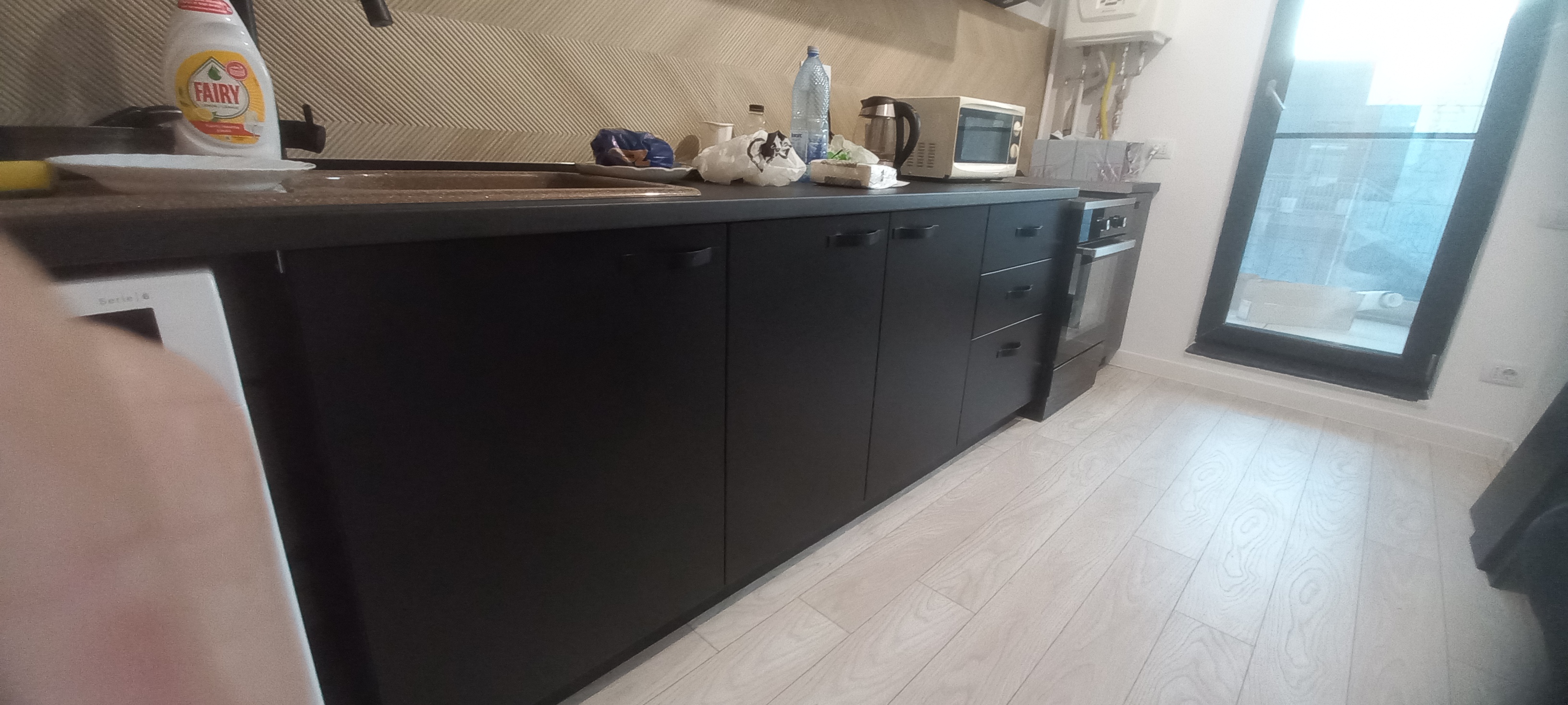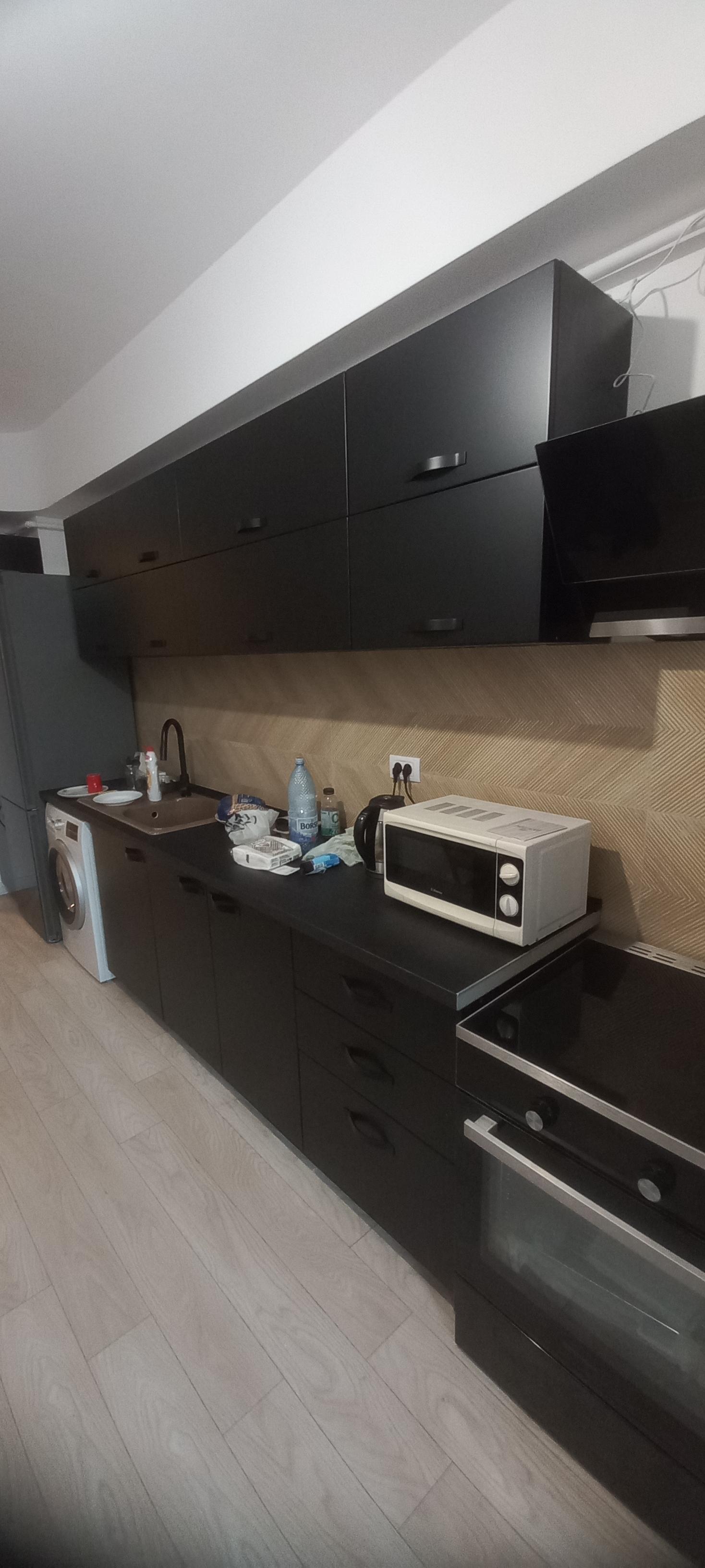 Bucătărie la comandă realizată din Pal Melaminat 18 mm grosime nuanță Negru la carcase și MDF Vopsit Mat la uși, blat termorezistent 38 mm grosime, canturi abs plastifiate, feronerie Blum cu închidere normală, mânere metalice negre, înălțător blat și plintă PVC nuanță gri aluminiu.